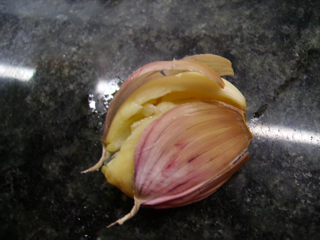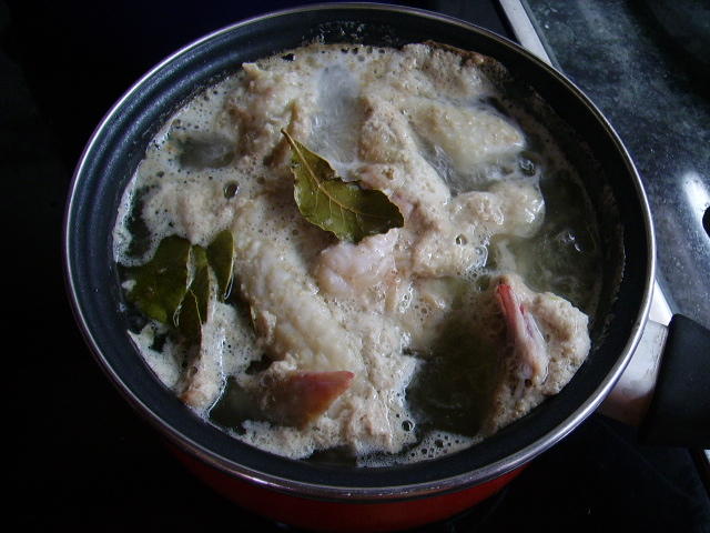 2.- Con la piel, todo el sobrante y el agua hacemos un caldo, con unas hojas de laurel y un poco de sal.