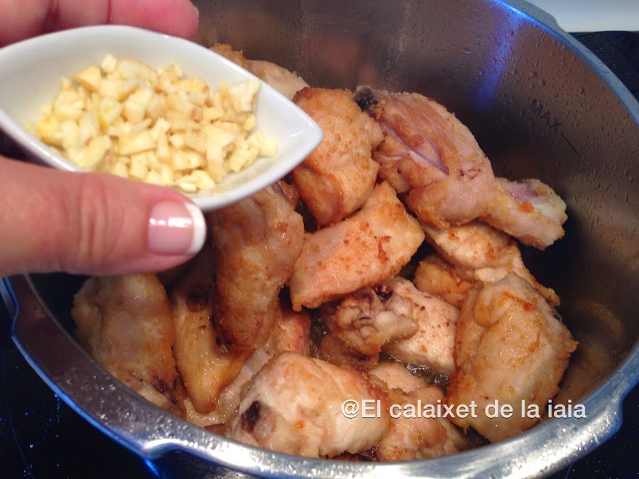 pelamos y troceamos el ajo y lo añadimos cuando el pollo esté dorado