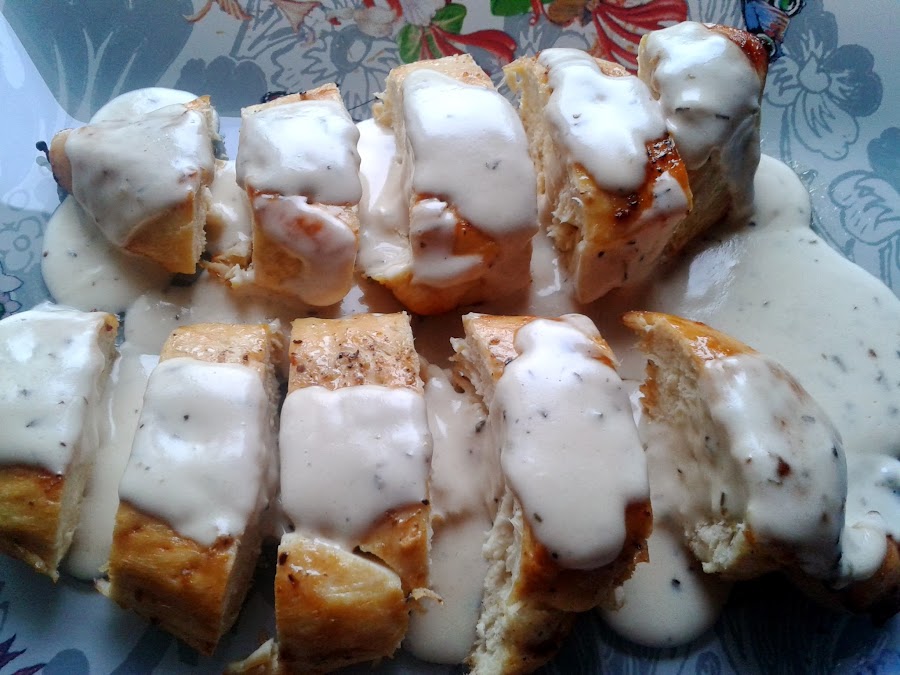 Corta las pechugas en tiras gruesas y colócalas sobre una fuente de servir, vierte la salsa por encima y listo, a disfrutar.
