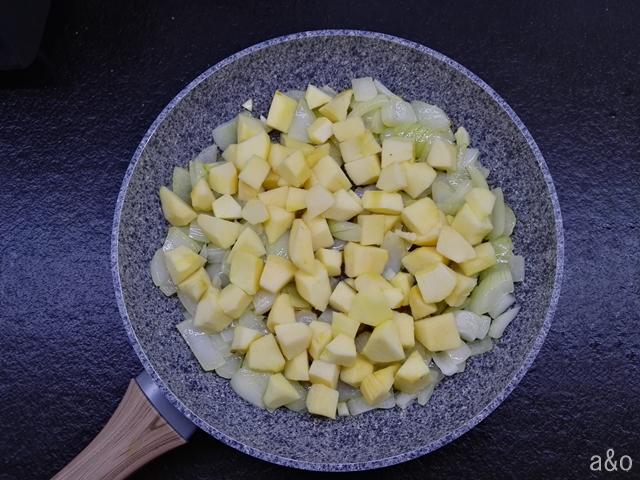 2º. A continuación, echamos las manzanas y esperamos a que se caramelicen un poco. Luego, vertemos el vaso de vino y dejamos que se cocine todo a fuego lento. El plan consiste en que los ingredientes se pongan más blanditos, se doren y se mezclen.