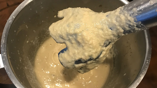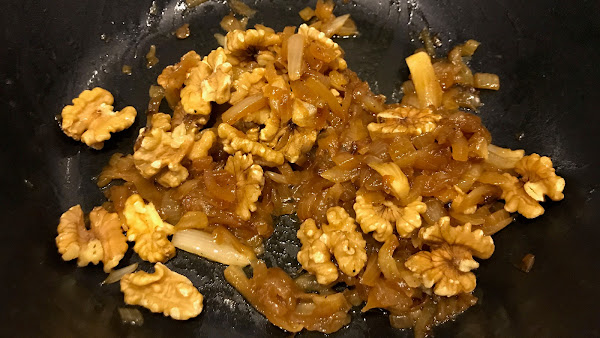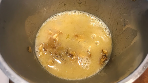 Pon la cebolla y la mitad de las nueces en un vaso de la trituradora, cubre con caldo y tritura.