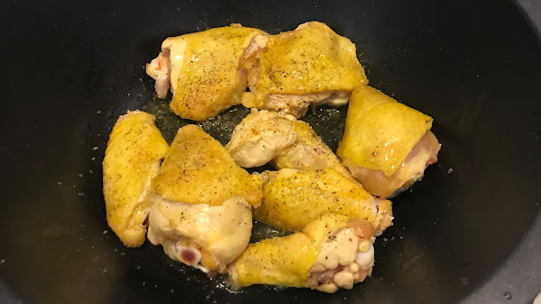 En una olla con un poquito de aceite de oliva y a fuego medio-alto (7/10) dora los trozos de pollo salpimentados.