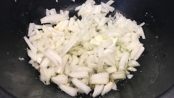 En esa misma olla pero a fuego bajo sofríe la cebolla hasta que esté casi caramelizada.