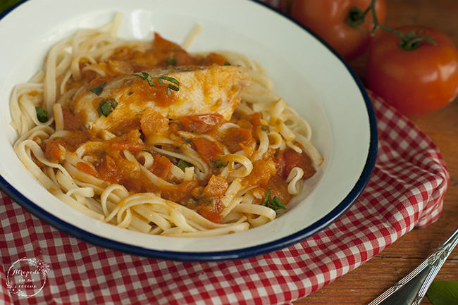 Hace tiempo que no publicaba una receta de pasta, aunque en esta receta queda en un segundo plano, ya que lo interesante es la salsa de tomate ajo, mantequilla y albahaca que acompaña al pollo y que se completa finalmente con los tallarines. Un plato completo sin duda, y además muy rico. La idea la vi en Pinterest que me lleva a blogs extranjeros muy interesantes, como éste.