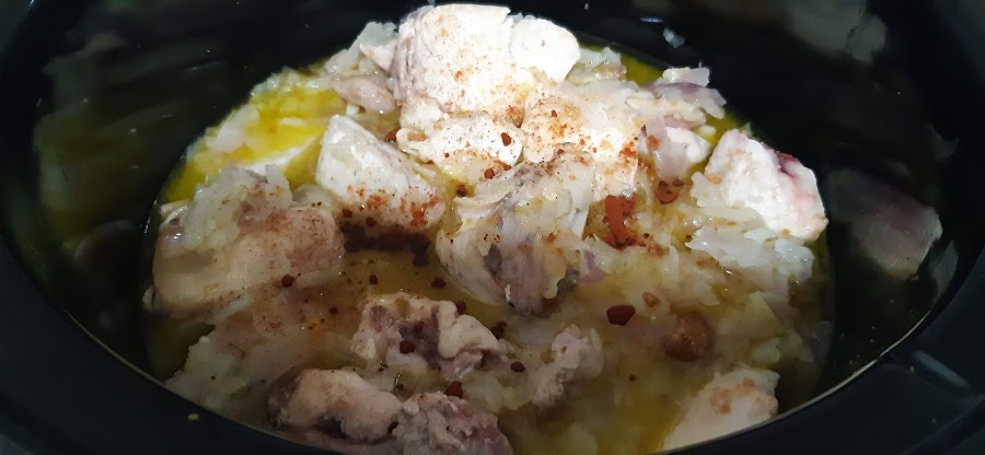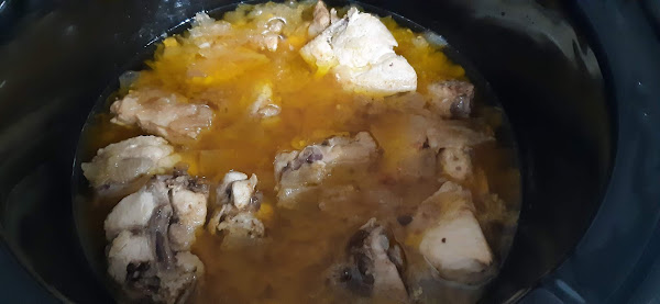 6.- Una vez que hemos puesto el agua, programamos 3 horas en alta. Cuando termine el tiempo sacáis el pollo y trituráis la cebolla y el ajo.