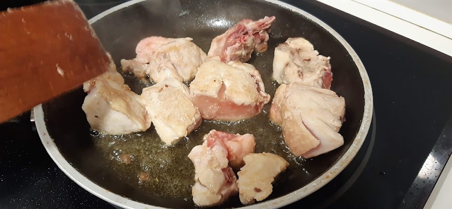 2.- Ponemos una sartén a calentar para ir sellando el pollo. Cuando esté caliente, añadimos el aceite y los trozos de pollo para ir sellándolos. A medida que los vayamos sellando los vamos poniendo en la olla.