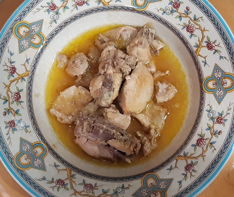 7.- Para emplatar poned los trozos de pollo y rociad con la salsa resultante de triturar la cebolla y el ajo.