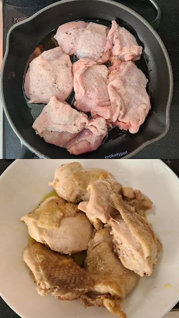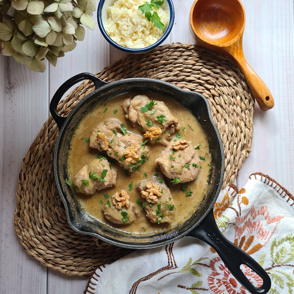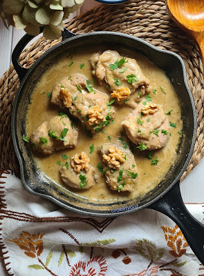 Este guiso, en cierto modo recuerda a nuestro pollo en pepitoria, lo suelen preparar con pollo o pavo, es típico tomarlo frío, en picnic y en navidad no suele faltar. Lo elaboran con una base de caldo de pollo muy concentrado, por ello he utilizado caldo de puchero Aneto, si no tenéis a mano podéis poner caldo casero que es bien rico.
