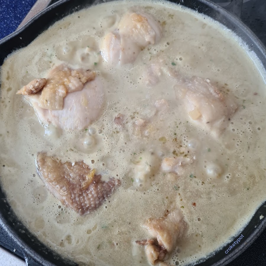 Ponemos el pollo en la sartén, dejamos que hierva y bajamos el fuego para que cocine a fuego lento durante 30 minutos sin tapar para que la salsa quede consistente.