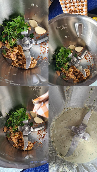 En un procesador de alimentos o en la trituradora ponemos las nueces, el perejil, el chile, los ajos, el jugo de limón y 1/2 vaso de caldo de pollo y trituramos hasta que quede una una pasta suave. Lo reservamos.