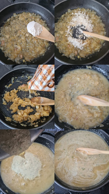 En la sartén dejamos como 2 cucharadas de aceite, ponemos a pochar la cebolla picada a fuego lento hasta que esté transparente. Añadimos la harina y movemos bien para cocinarla , cuando tenemos el roux, añadimos el caldo poco a poco moviendo para que se suelte la harina, lo dejamos hervir y se baja el fuego, añadimos la pasta de las nueces y mezclamos bien.