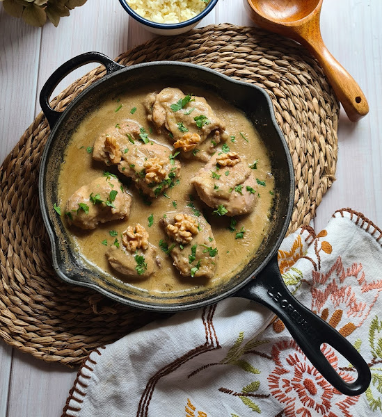 Para la salsa satsivi: 1 puñado de nueces, 2 dientes de ajo, perejil o cilantro, guindilla a gusto, 1 vaso de caldo de pollo y zumo de medio limón.