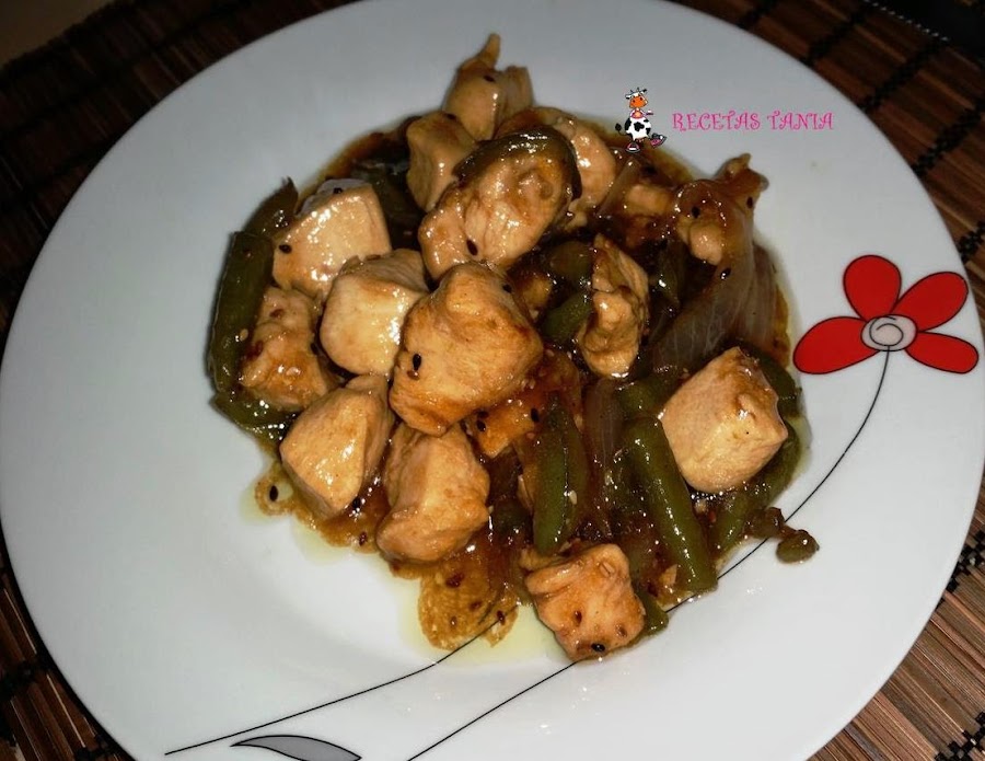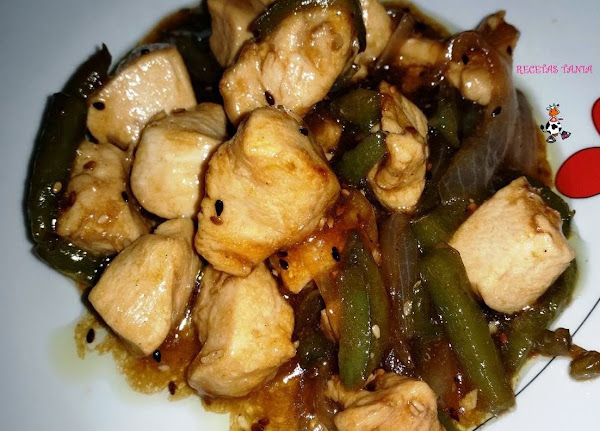 En una sarten pequeña ponemos las semillas de sésamo y dejamos que se tuesten,cuando estén tostadas retiramos del fuego y reservamos. En una sarten ponemos un chorrito de aceite de oliva y sofreímos la cebolla y el pimiento cortado en juliana, luego añadimos el pollo en taquitos y removemos hasta que el pollo esté hecho. Añadimos la salsa Teriyaki,yo compre un bote en lidl (que está buenísimo) pero también podéis hacer la receta de la salsa arriba donde los ingredientes os puse el enlace de la receta. Bajamos el fuego removemos bien y dejamos 5 min a fuego bajo,añadimos las semillas del sésamo tostado,mezclamos y emplatamos.