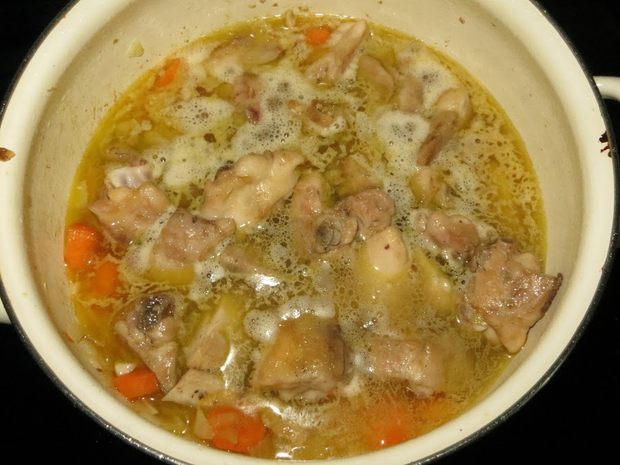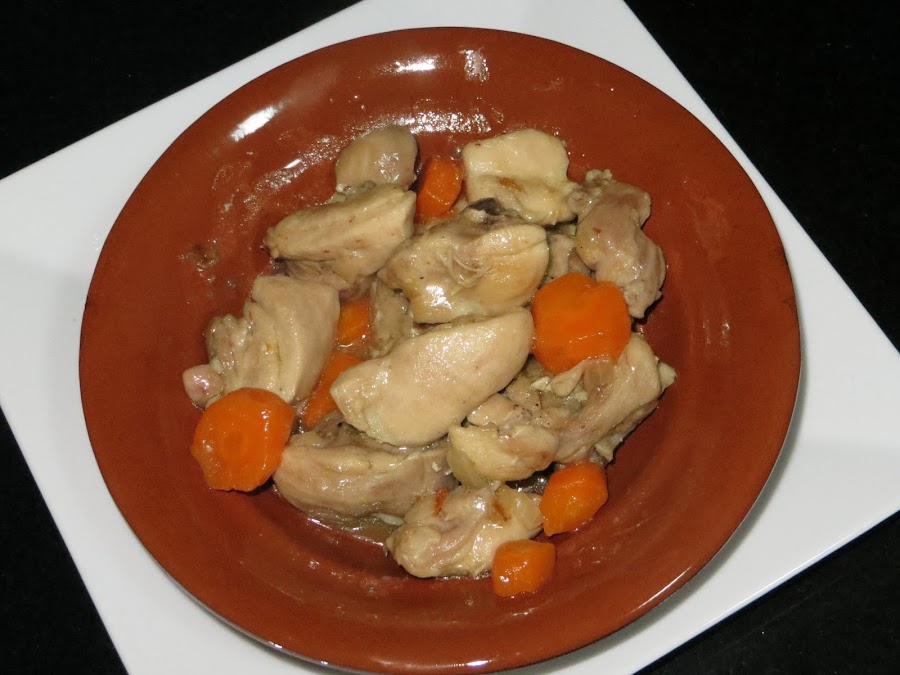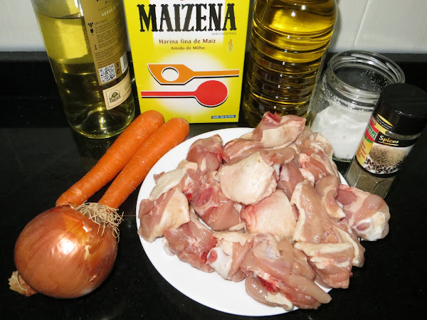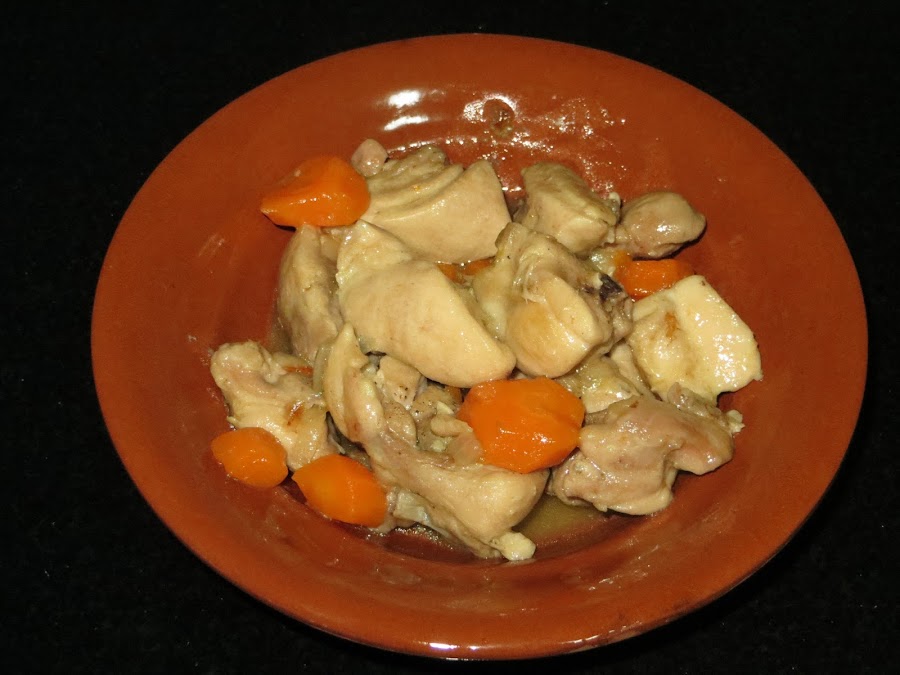 Cuando ya está todo pochado, se añade un buen chorro de vino se sube el fuego y se deja que se evapore, mientras con una cuchara de madera rascamos el fondo para sacar todos los jugos del pollo. Cuando ya se ha evaporado, añadimos el pollo con dos vasos de agua, en uno de ellos disolvemos una cucharadita de maicena para que se espese un poco la salsa, y dejamos que cueza a fuego medio durante una hora y ya está lista para servir.