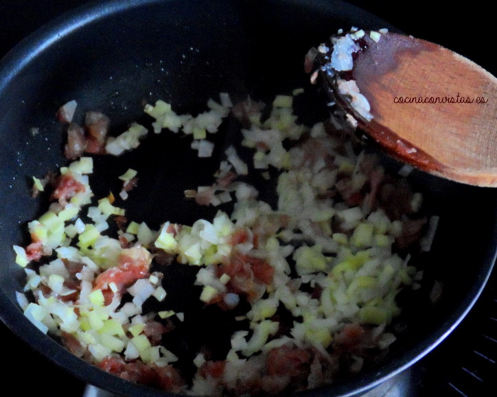 Mientras la preparación está en el horno, hacemos la salsa: en una sartén ponemos 1 c.s de aceite y echamos el bacon muy picadito, esperamos hasta que esté crujiente, momento en el que añadimos el puerro y pochamos suavemente.