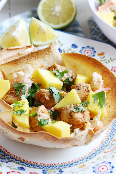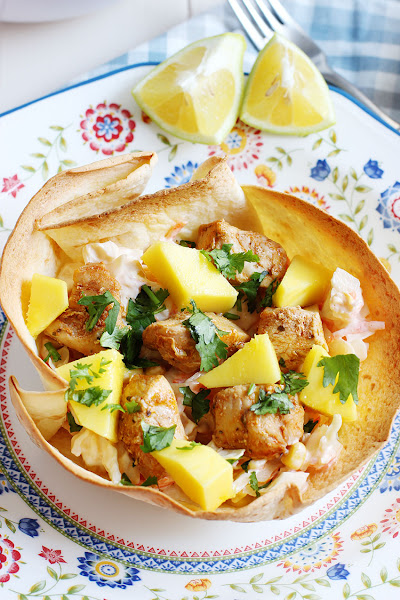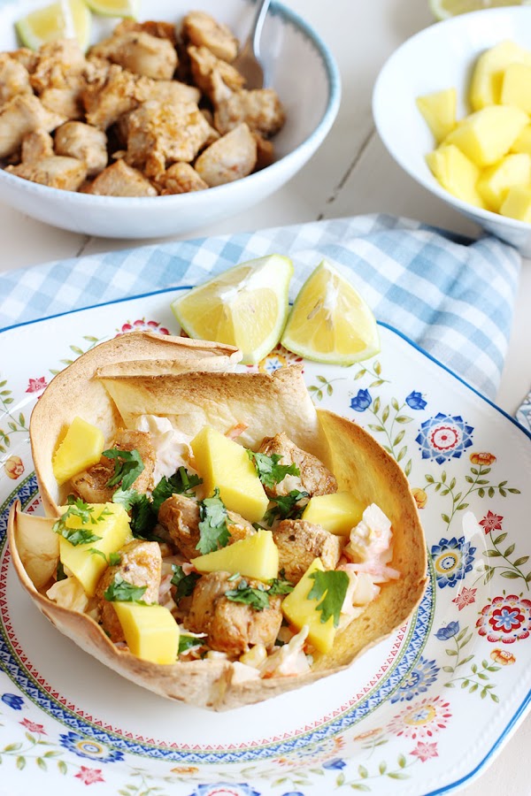 Como base un poco de ensalada, seguimos con el pollo y por último el mango y un poco de cilantro.