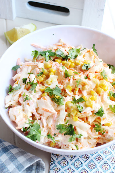En un bol echar la col, la zanahoria, el maíz, sal y pimienta y mezclar todo con mayonesa.