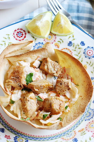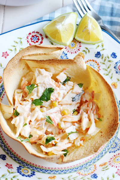En un molde redondo de 18 cm introducimos la tortilla de trigo y le damos un poco de forma a los bordes, hacer una bola con un poco de papel de aluminio y la colocamos en el centro para que los bordes se mantengan derechos, hornear unos 10 minutos, controlar que no se quemen, sacar del molde y dejar enfriar por completo antes de rellenar.