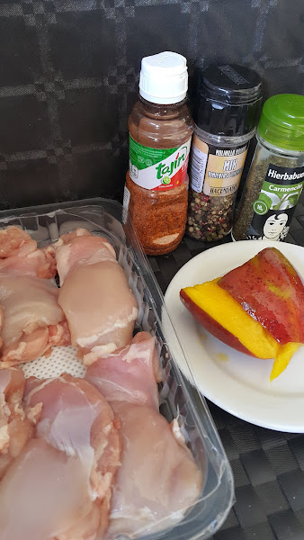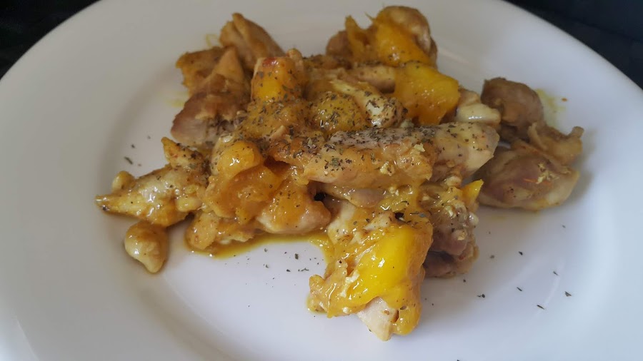 Hoy os traigo una receta de pollo con un toque tropical y mucho sabor. Para esta receta de puede utilizar también pechuga de pollo o incluso pavo y conejo ya que son carnes con sabores muy compatibles.