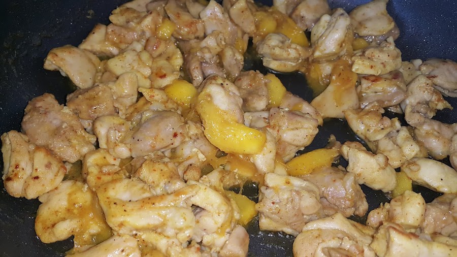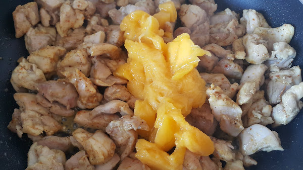 Pelamos y cortamos el mango, cuanto más maduro esté mejor ya que más sabor aportará al plato. Lo añadimos al pollo.