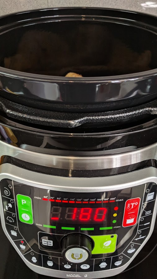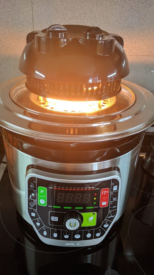 Cerramos con la tapa de cristal y programamos menú fuego lento a 110 grados durante 180 minutos. Ojo que los cuartos que he puesto eran grandes y gruesos. Si los tuyos son más finos acorta el tiempo en 50 minutos.