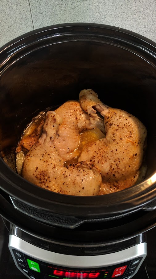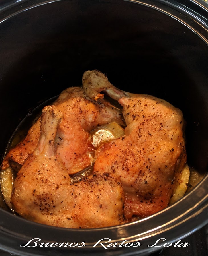 Cada vez procuro acoplar más recetas en la slowpot, estoy encantada con los resultados. La de hoy, de pollo, la he cocinado a 110 grados, es la temperatura máxima para que pueda ser considerada receta de cocina lenta.