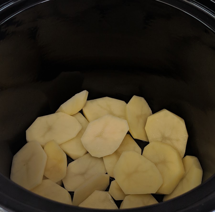 Por la mañana pelamos y cortamos las patatas en rodajas gruesas (algo más de 1 cm). Untamos el fondo de la cubeta con AOVE y las colocamos como muestra la foto