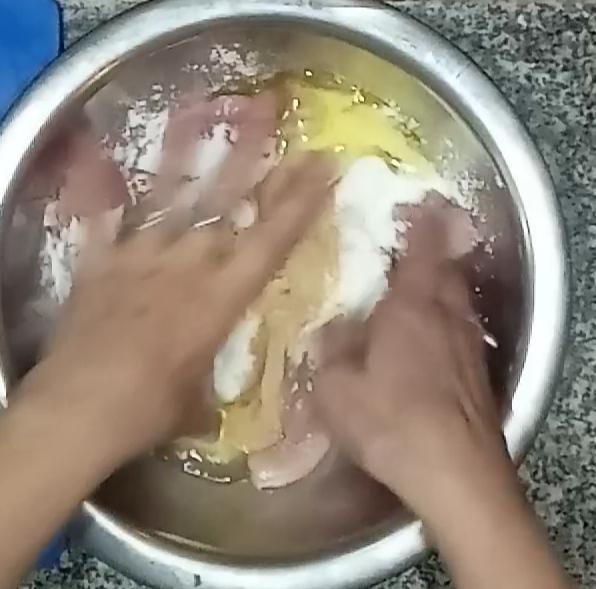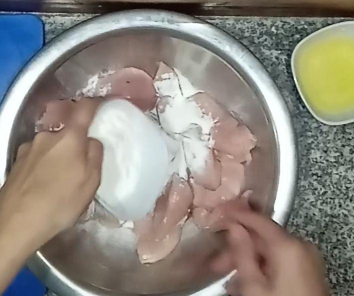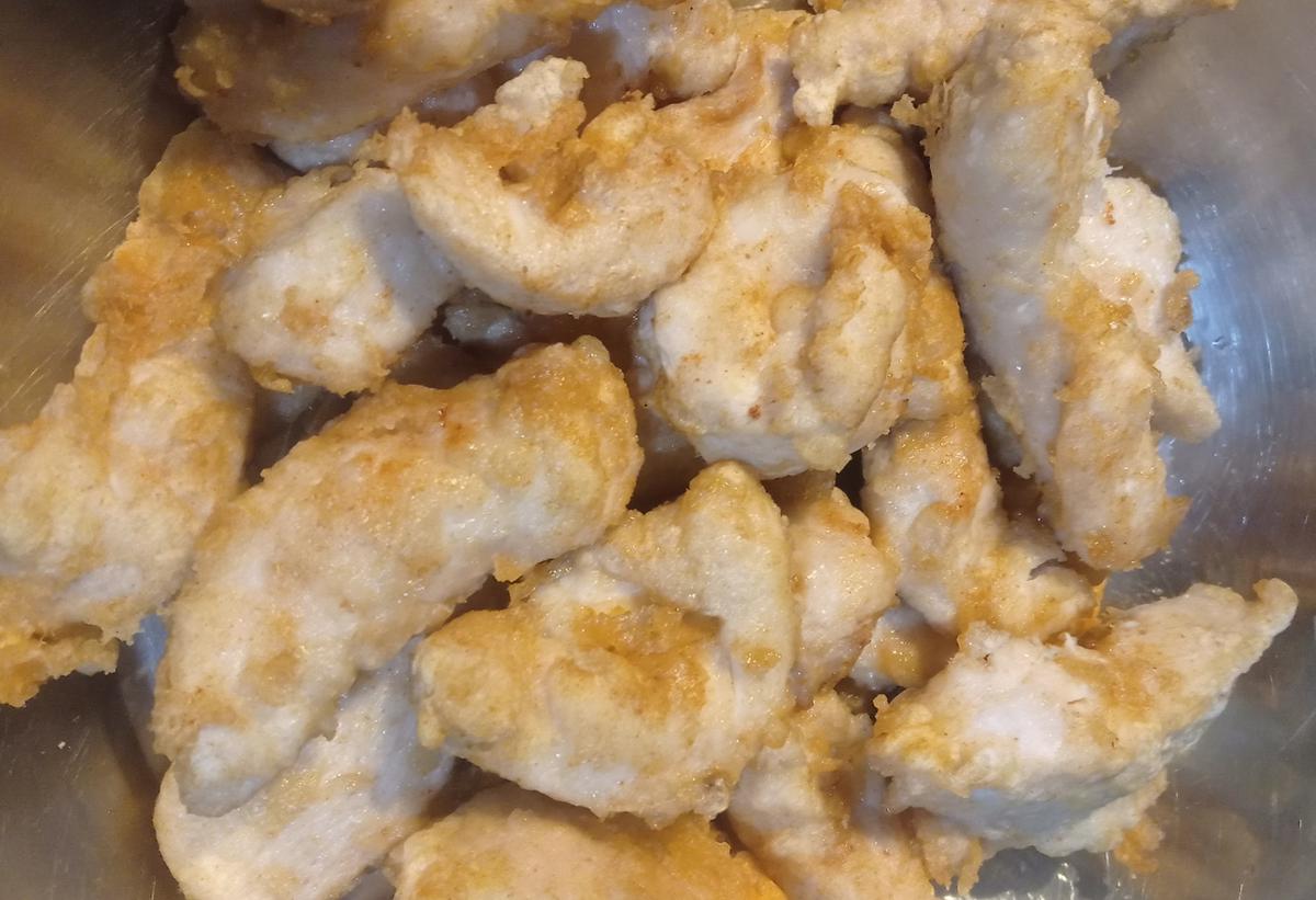 Cortamos el pollo en juliana y trozos pequeños y lo mezclamos con la marinada de claras y todos los demás ingredientes , mezclamos bien con las manos y dejamos reposar 5 minutos.Hacemos una primer fritura en aceite bien caliente, por partes, y vamos retirando en una fuente