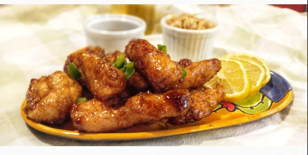 Calentar en una sartén o wok, la salsa de soja con el ajo , el jengibre, la miel, el limón , el vino y revolver bien, luego añadir la fécula disuelta en un poco de agua y condimentar, con pimienta, pimentón, y sal , primero no poner sal ya que la salsa de soja es salada , probar y agregar si hace falta, y en cuanto espesa agregar todo el pollo y mezclar bienServir con arroz o papas y rodajas de limón