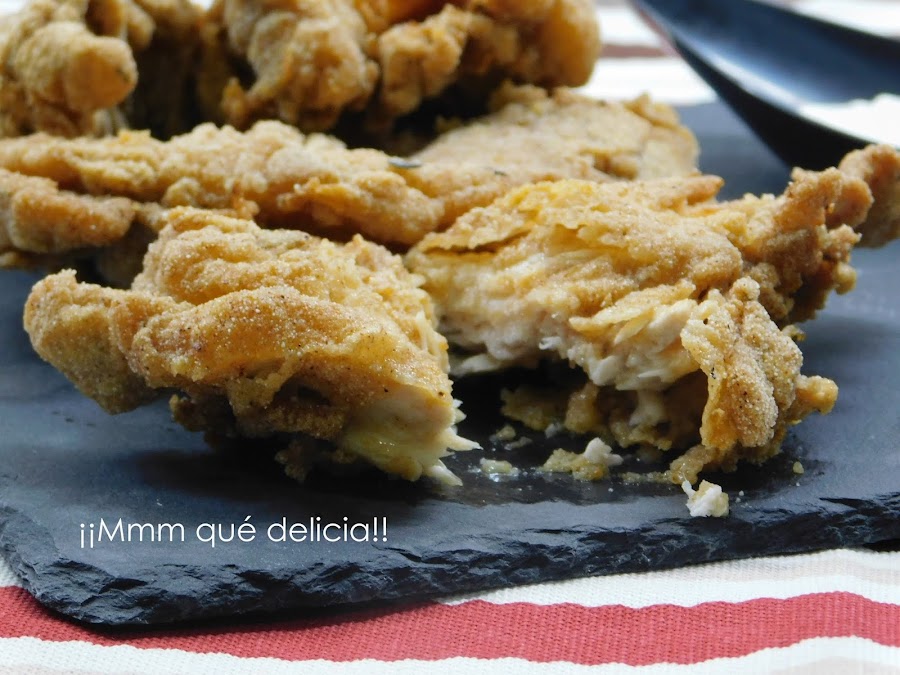 Finalmente freímos las tiras de pollo en abundante aceite de oliva caliente durante unos 3 minutos, o hasta que el rebozado tenga un color dorado, y ¡¡YA ESTÁ LISTO!!