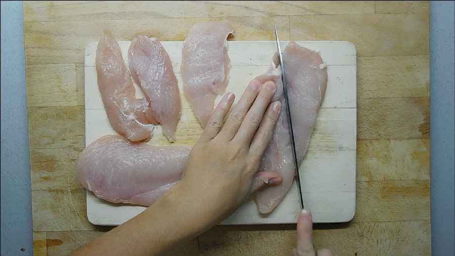 Primero, fileteamos la pechuga de pollo en tiras más o menos gruesas para que quede jugoso y no se reseque el pollo al freírlo.