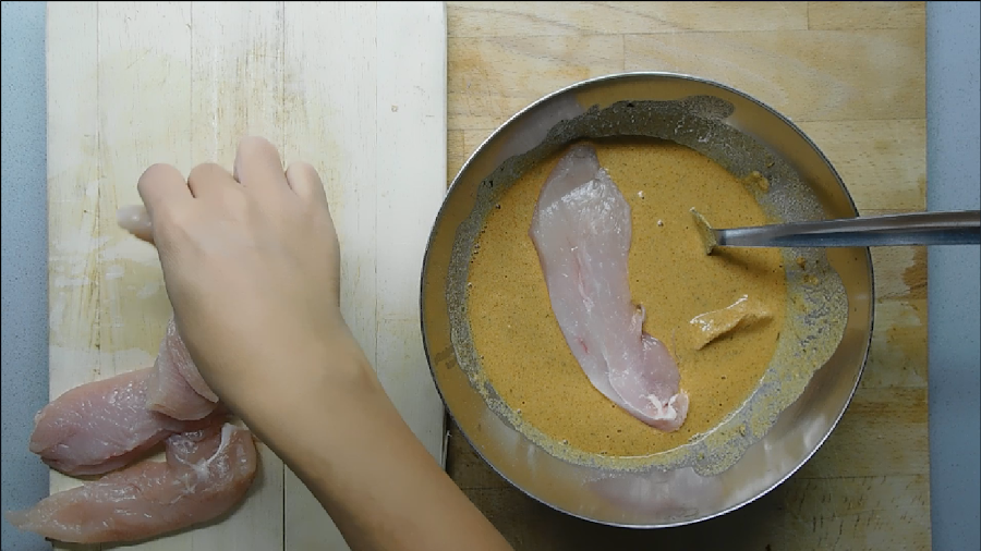 Después, mezclamos en un bol todos los ingredientes del marinado hasta conseguir una mezcla espesa, parecida a la mezcla de tortitas americanas; líquida pero algo espesa. Sumergimos las tiras de pollo en el marinado, las tapamos y las reservamos en el frigorífico hasta que se vayan a consumir. Es preferible dejar que marinen durante 24 horas para que tomen todo el sabor de las especias, pero si tienes prisa, con 4 horas es suficiente.