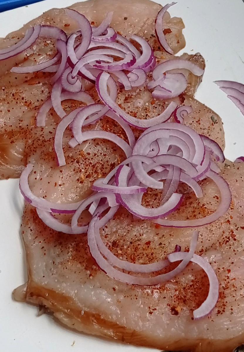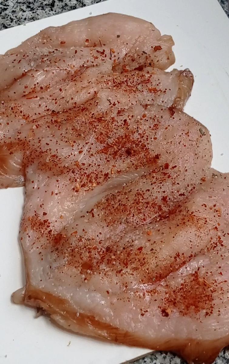 Filetear las pechugas y unirlas, poner un film sobre ellas y aplastar suavemente para que se unan y formen una sola pieza, condimentar con sal y pimentón.