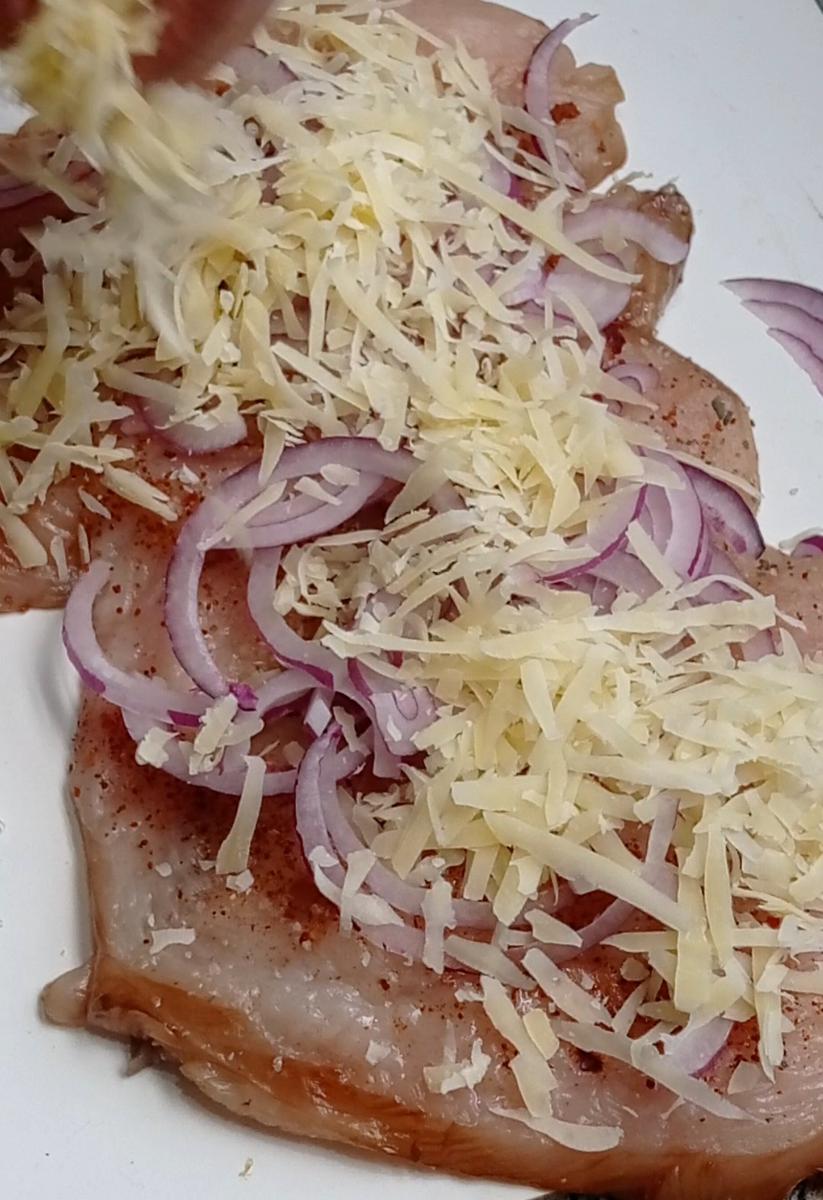 Distribuir encima la cebolla cortada en aros y el queso rallado grueso.