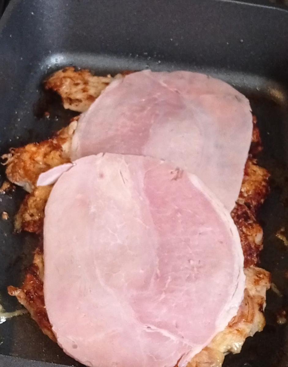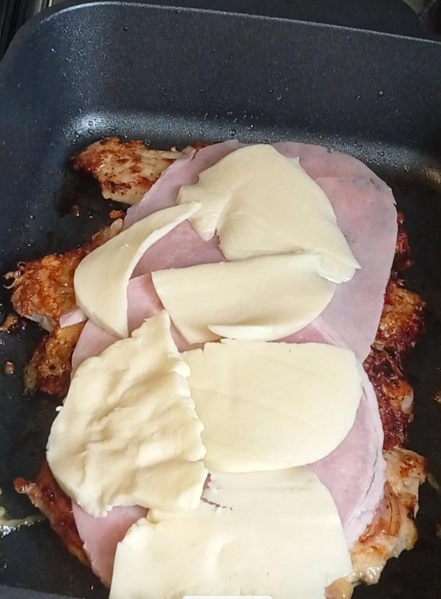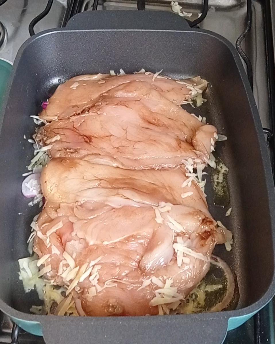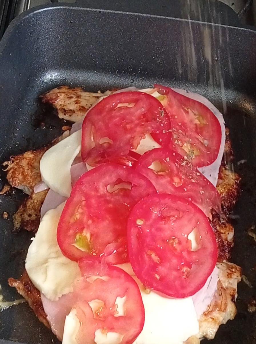 Acomodar encima las fetas de jamón, la mozzarella en fetas, el tomate en rodajas y el orégano, como lo hice en la Essen rectangular la tapé y cociné unos minutos hasta que estuvo el pollo cocido y el queso derretido.