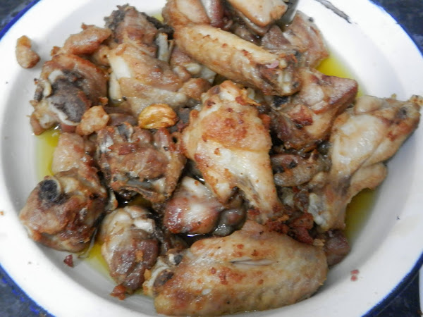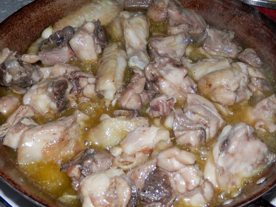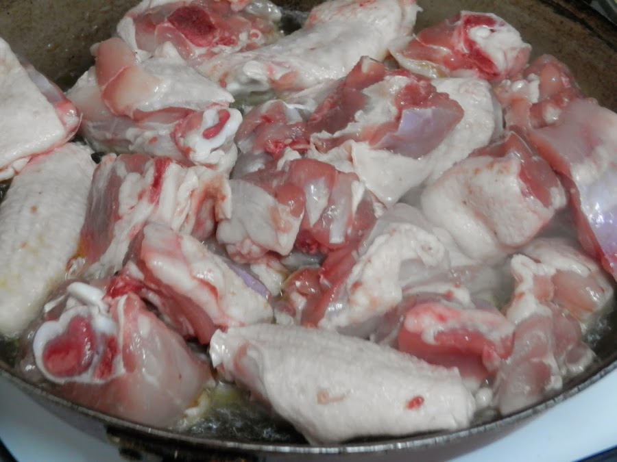 Echamos el pollo a la sartén y después de sofreír un momento y empiece a tomar color, añadiremos las dos hojas de laurel, habiéndolo remolido previamente con las manos.