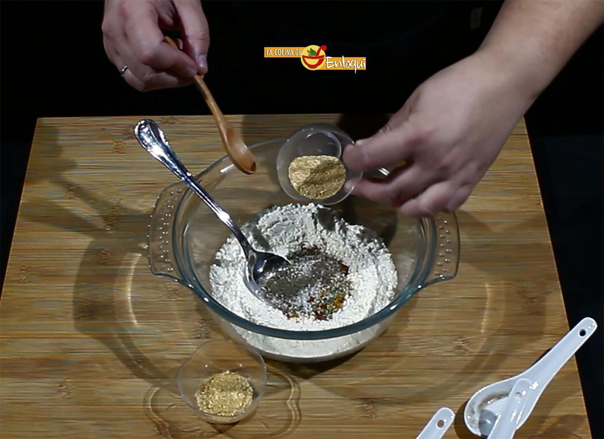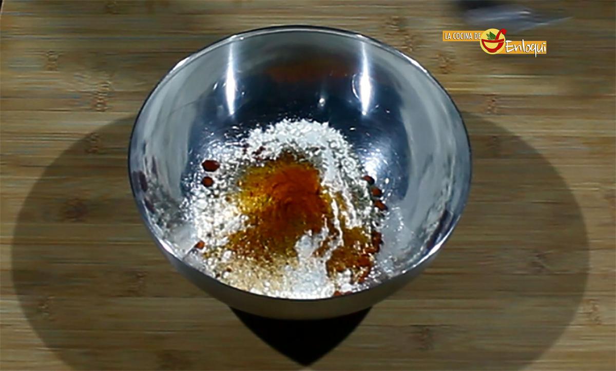 Una vez pasado el tiempo de marinado es el momento de preparar el rebozado. Pon la harina en un recipiente amplio y mezcla con el resto de especias para el rebozado.