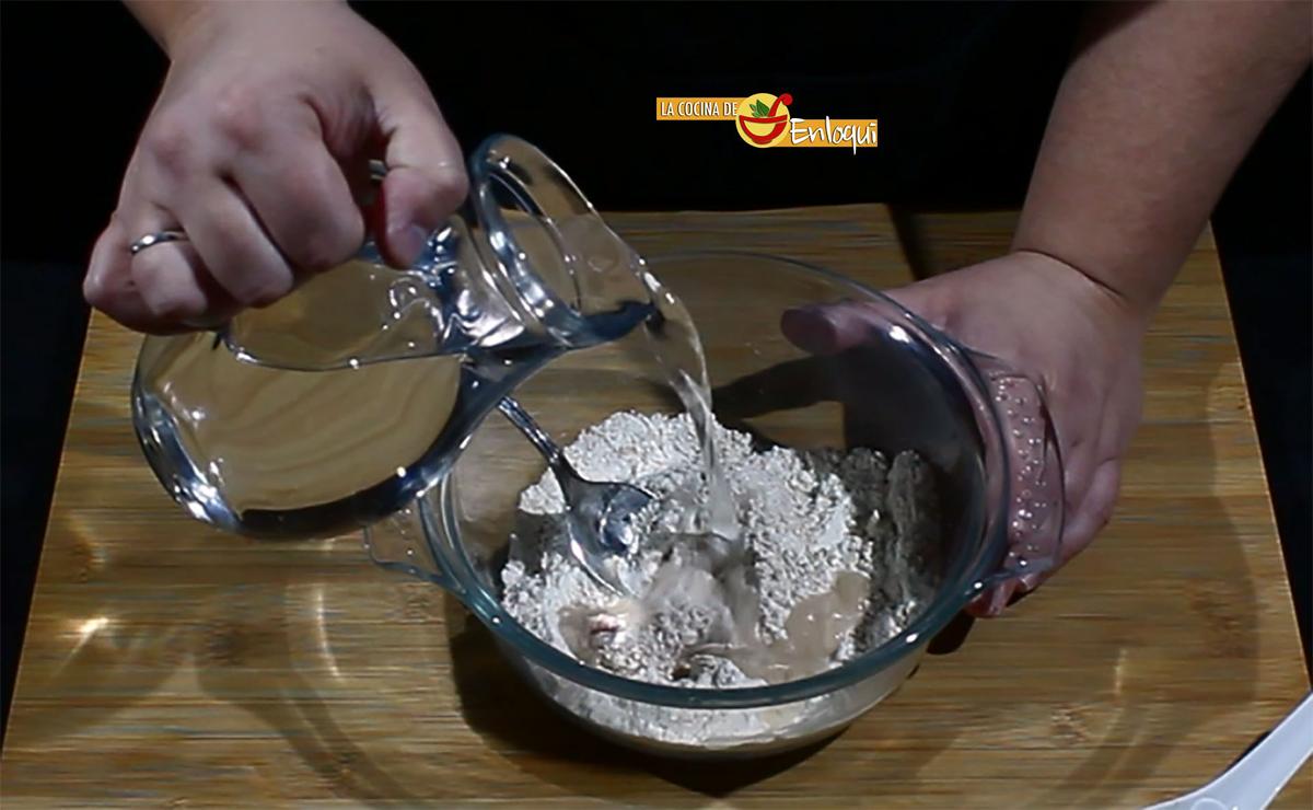 Para preparar el marinado debes poner en un bol la harina junto con el resto de especias para el marinado. El pimentón dulce y picante, el tomillo, el romero, el ajo y la cebolla en polvo, la sal y la pimienta. Mezcla todo bien y añade el agua. Remueve hasta conseguir una mezcla homogénea, una masa de espesor similar a la masa de tortitas.
