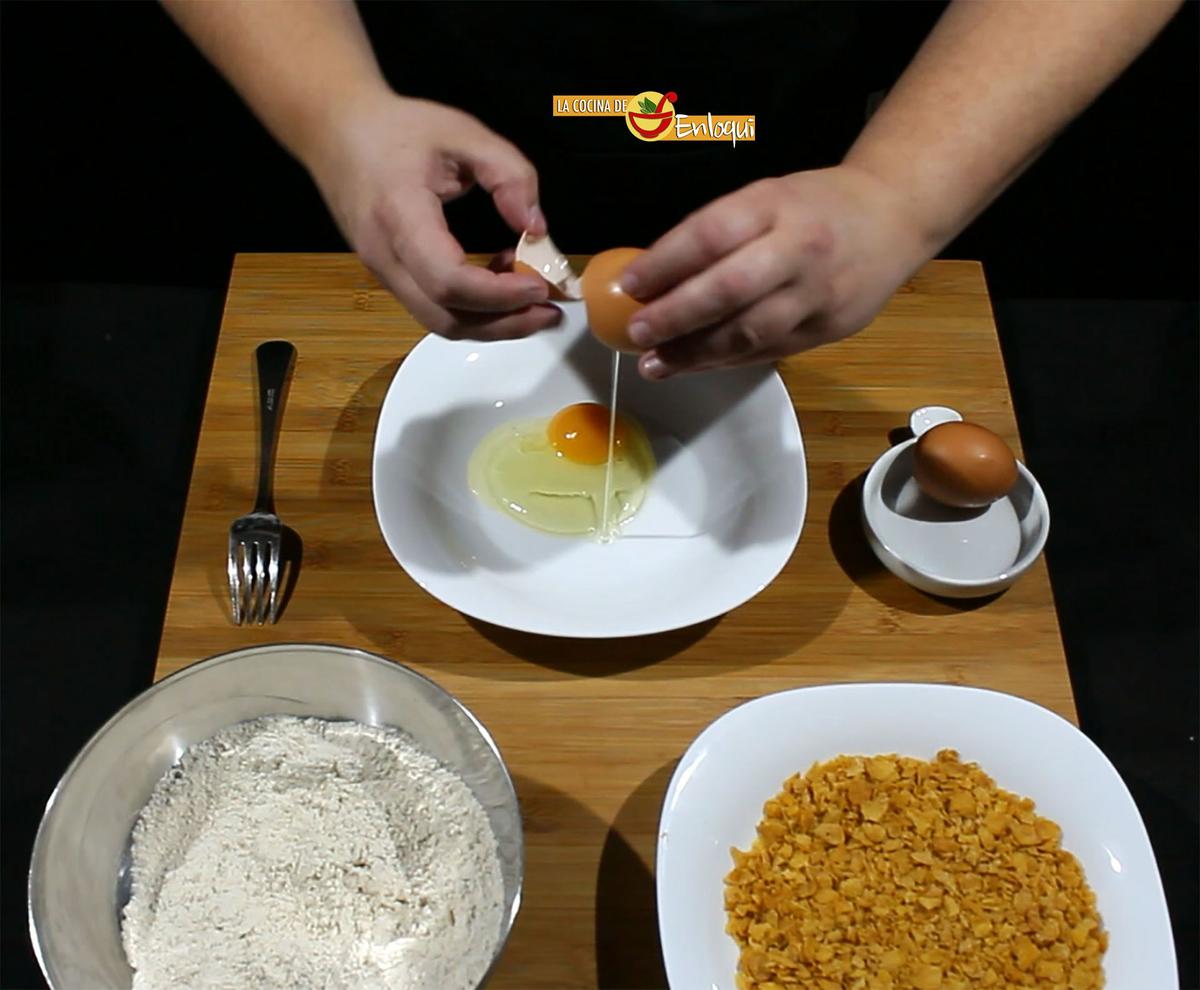 En otro recipiente bate el huevo y en un tercer bol pon los cereales ligeramente molidos.