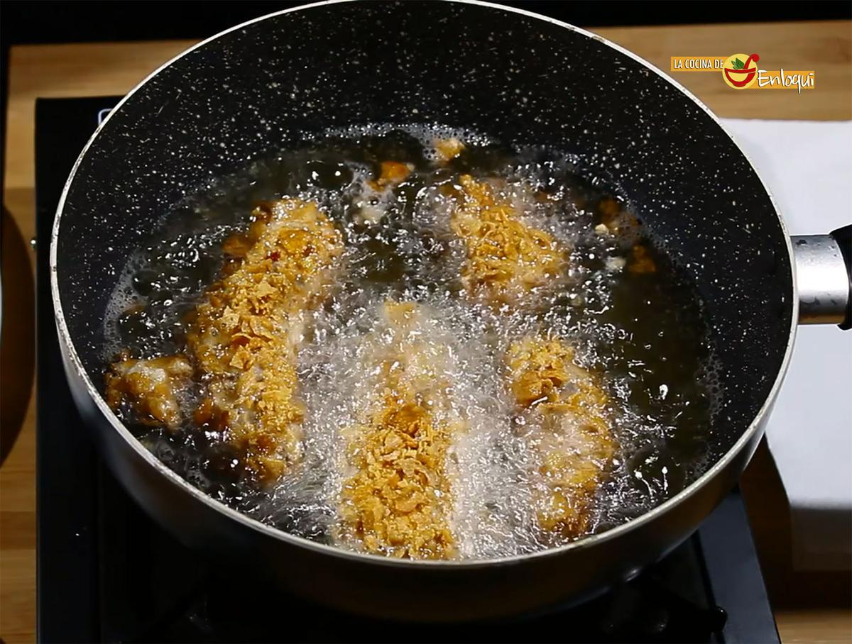 Mientras que realizas el proceso de rebozado pon a calentar una sartén con abundante aceite, así cuando termines de rebozar irás poniendo a freír directamente.
