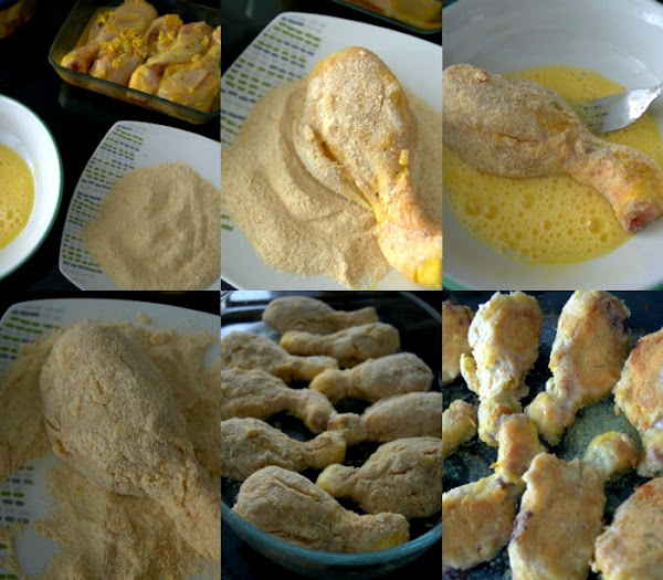 Dip the chicken drumsticks into the grated bread, then into the beaten egg and later, into the grated bread again. Press so the bread sticks to the chicken.