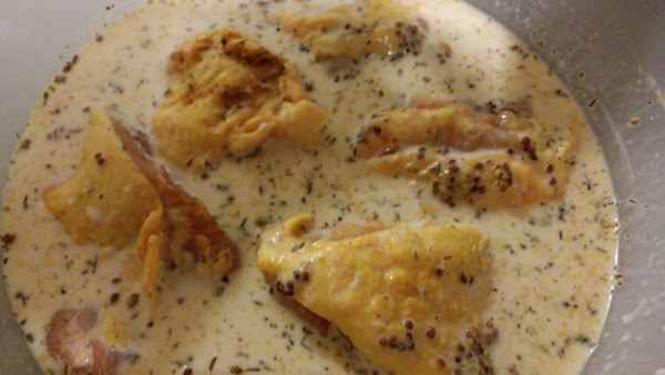 2. Sala los trozos de pollo, incorpóralos al bol con las especias, mezcla y añade una cucharada de mostaza a la antigua. Mezcla de nuevo y añade el cubito de pollo desmenuzado y un vaso de leche.