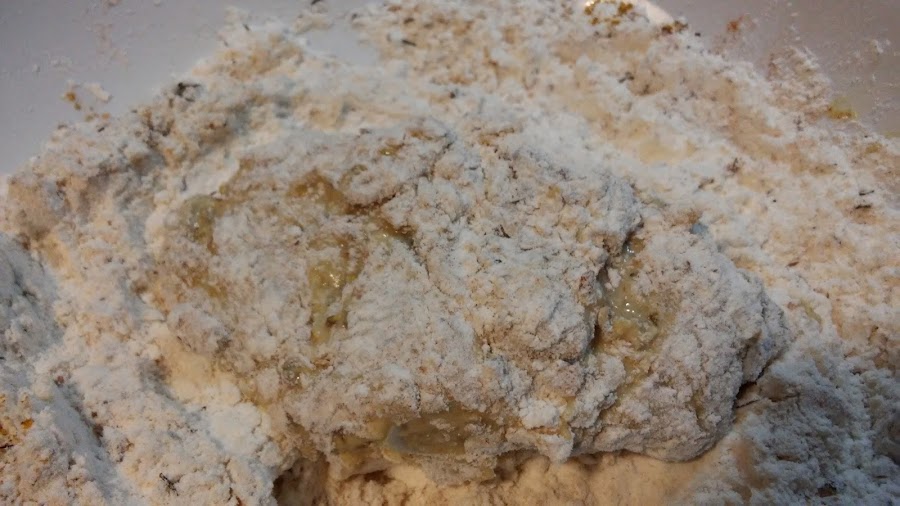 3. Mezcla la harina con las especias que reservaste y reboza el pollo. No escurras demasiado para que quede bien jugoso. Para que esté bien crujiente reboza dos veces (moja en el preparado de leche y especies, reboza en harina; moja de nuevo en la leche y vuelve a rebozar con harina.)