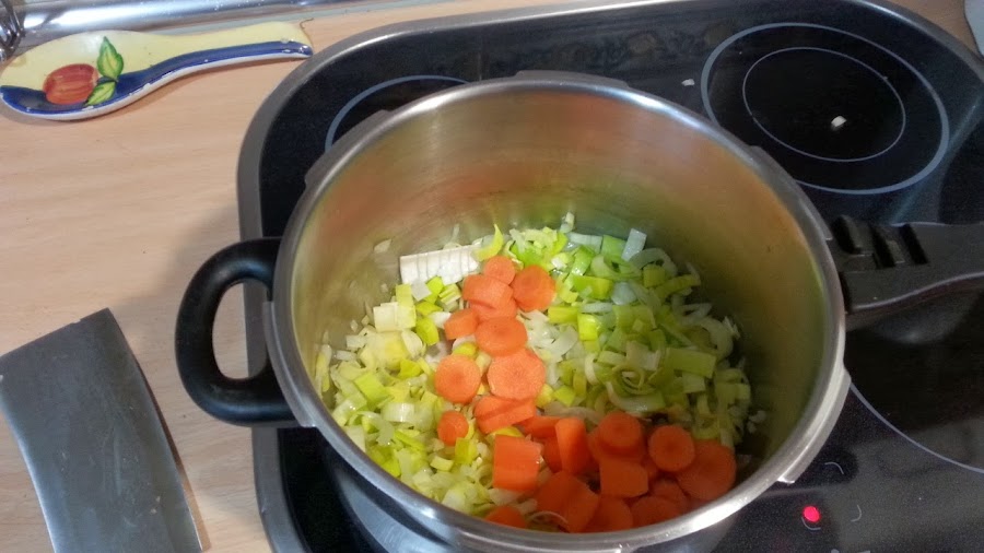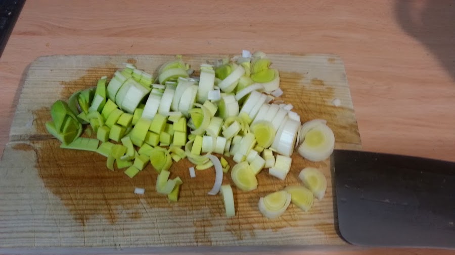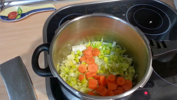 Echamos en una cazuela, aceite y vertemos la cebolla picada y el puerro, salamos y a fuego medio la pochamos