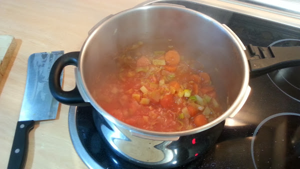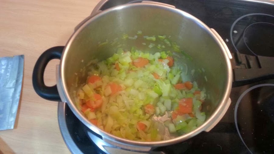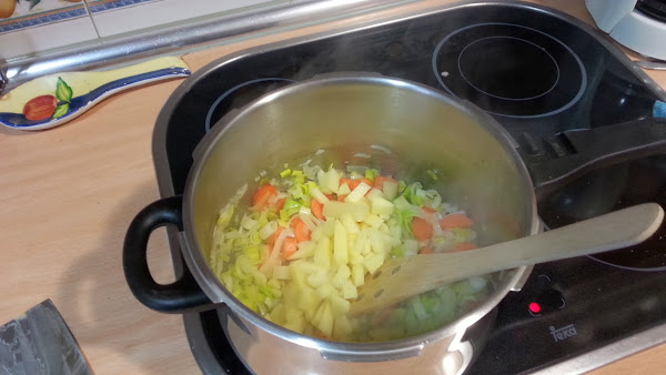Una de las patatas la picáis en trozos muy pequeños con el objetivo de que se deshaga y de espesor al caldo, se la agregáis...
