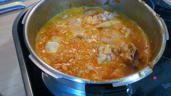 subimos el fuego a tope hasta que empiece a hervir y cuando empiece a hervir lo bajamos a fuego medio y a esperar que se vaya haciendo removiendo de vez en cuando, ojo, mover despacio que el pollo se deshace con facilidad.