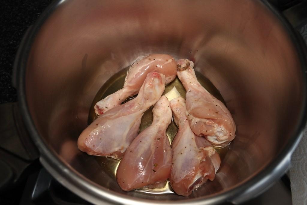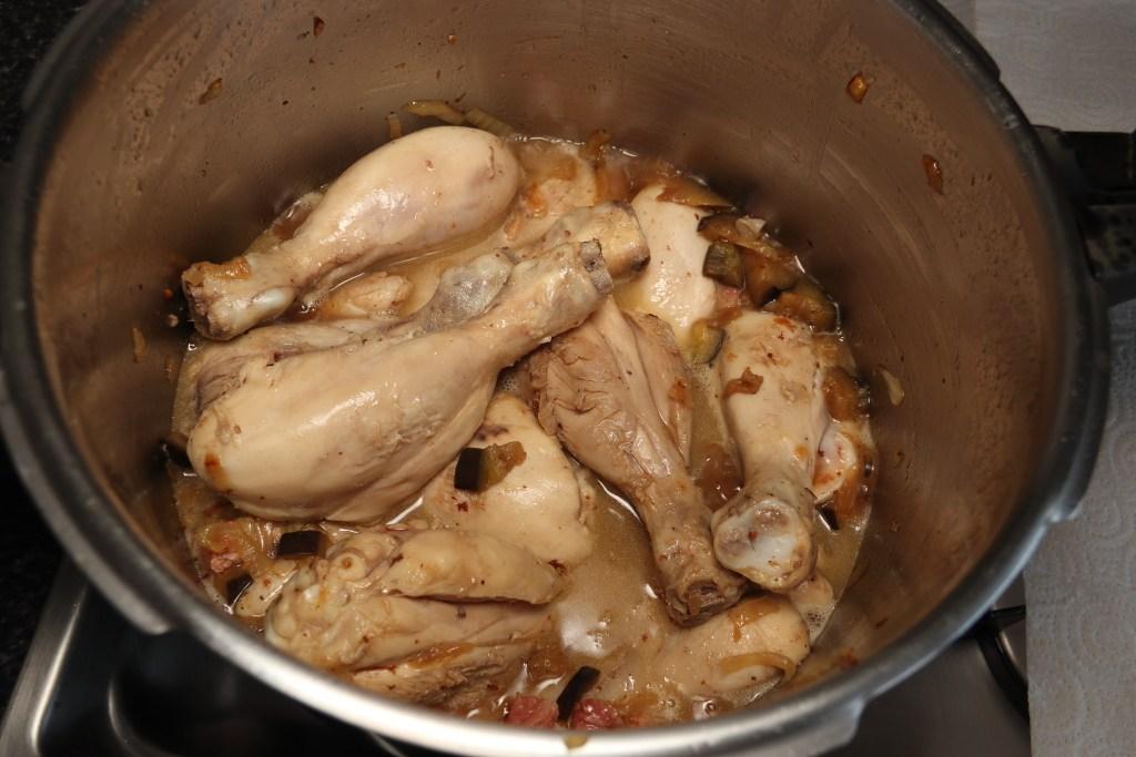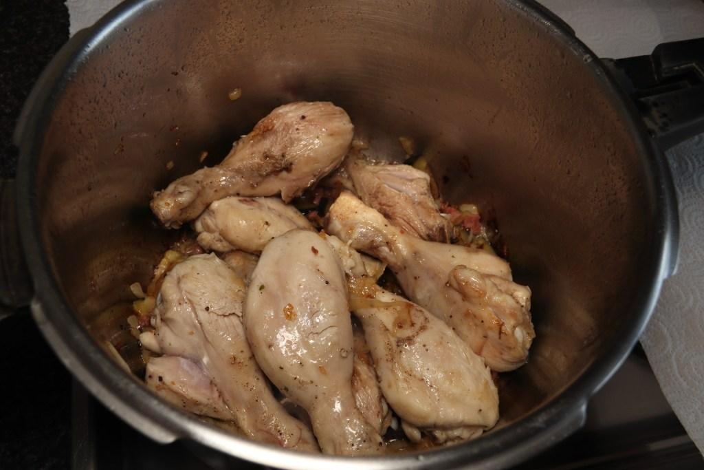 Vertemos aceite de oliva en la olla, llevamos al fuego y freímos el pollo, tapamos porque salpica bastante. Una vez dorado por todas sus caras, retiramos y reservamos.