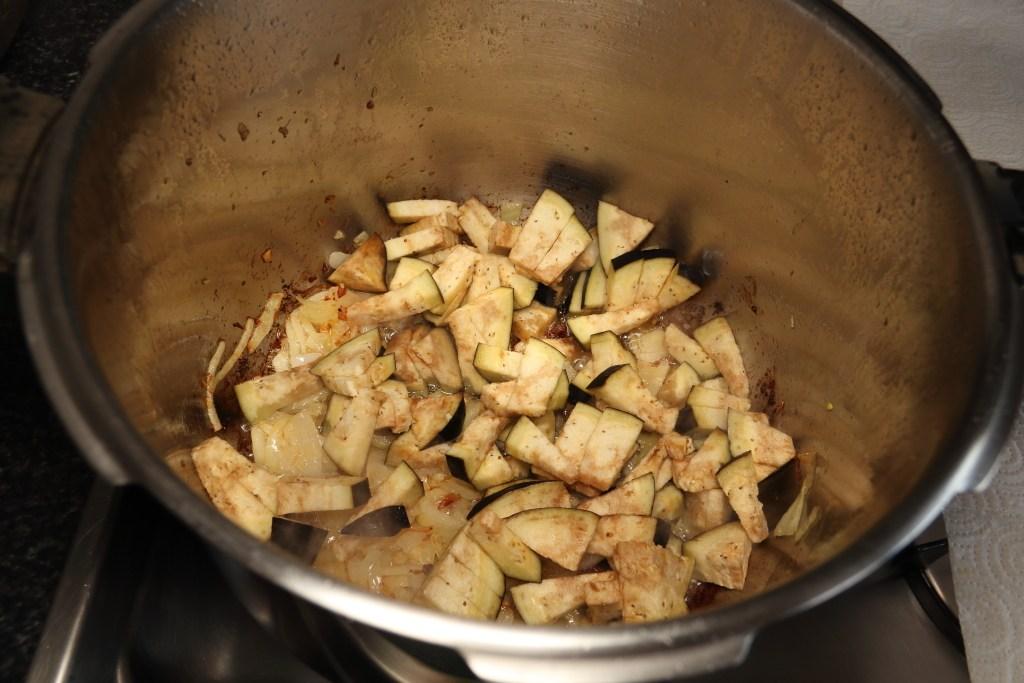 En el mismo aceite del pollo doramos la cebolla y el ajo, que se pochen bien, agregamos la berenjena, removemos y dejamos hacer unos 5 minutos.