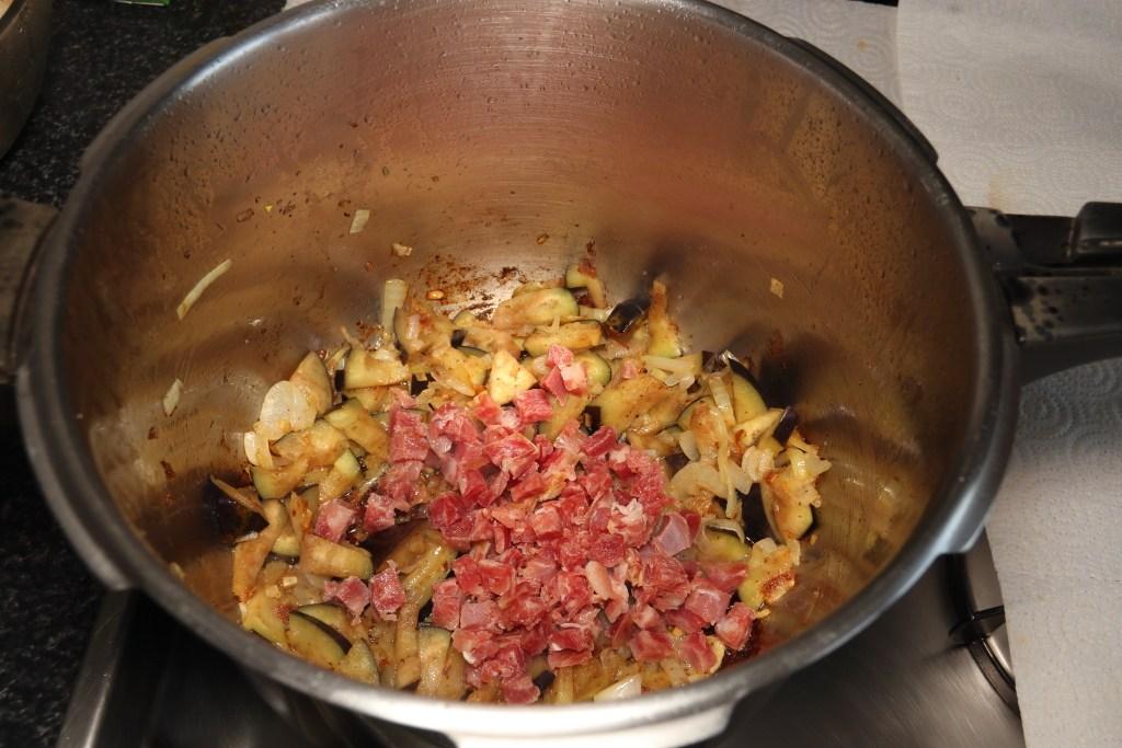 Añadimos el jamón, mezclamos y dejamos poco tiempo porque se seca y se sala.