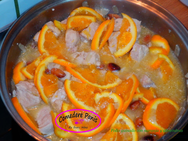 Exprimimos una de las naranjas y la otra la lavamos muy bien y la cortamos en juliana, añadimos en zumo y la naranja cortada y dejamos cocinar unos 10 minutos más.